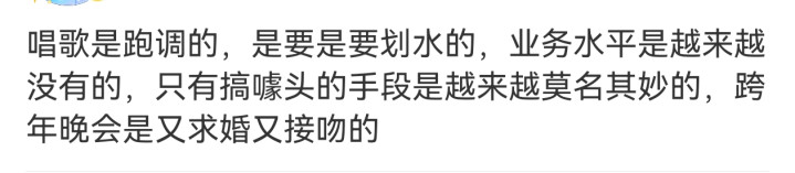 又是求婚又是接吻的搞噱头,搞得越来越奇妙,业务水平也很拉垮。唱歌跑调。
